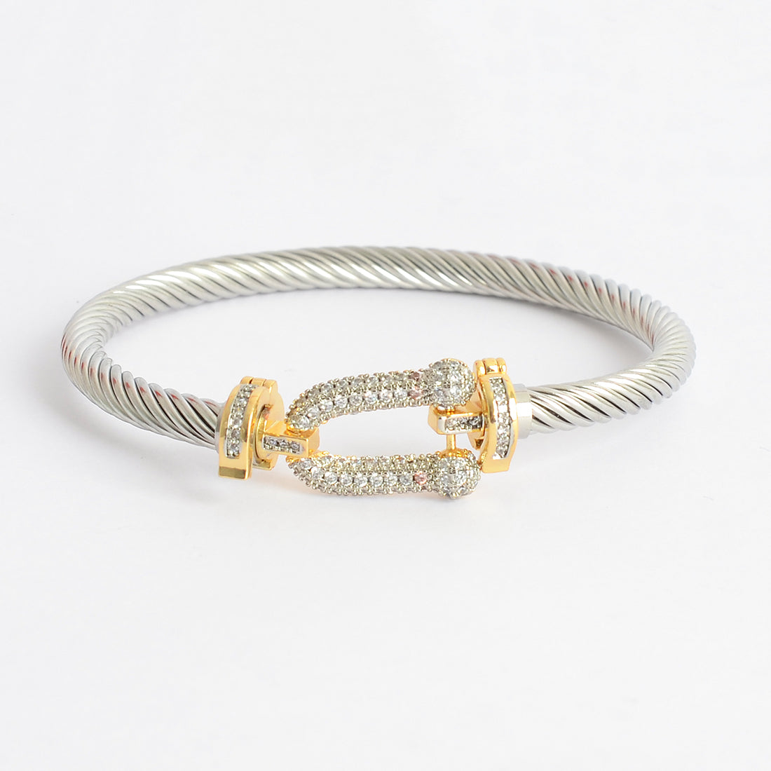 - سوار أنيق مرصع بفصوص الزركون على شكل حرف U باللون الفضي وجزء ذهبي