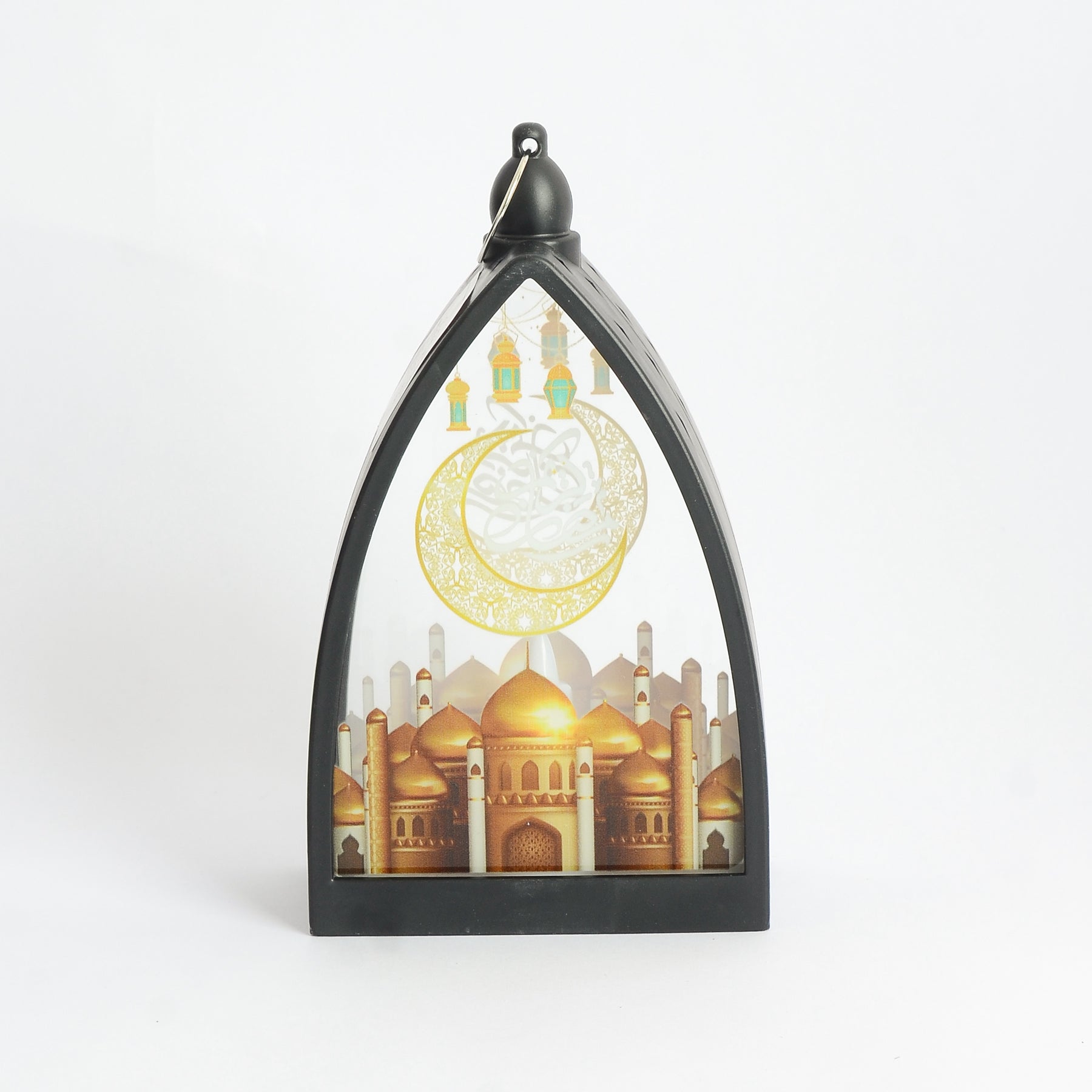- عبارة عن فانوس رمضان بشمعه ليد مصنوع من البلاستيك والاكريليك بتصميم هرمي