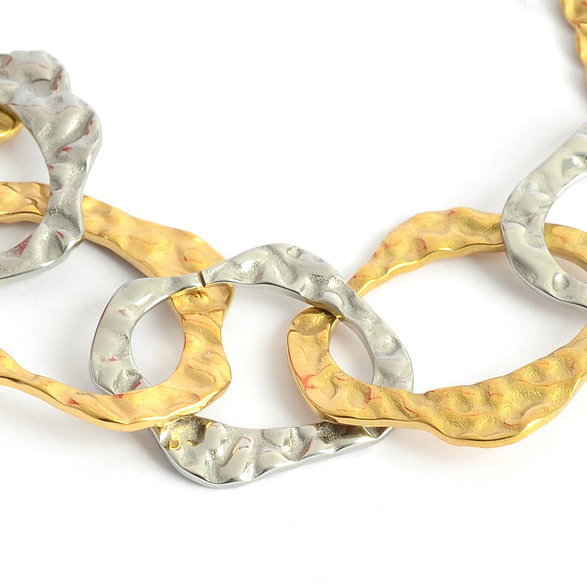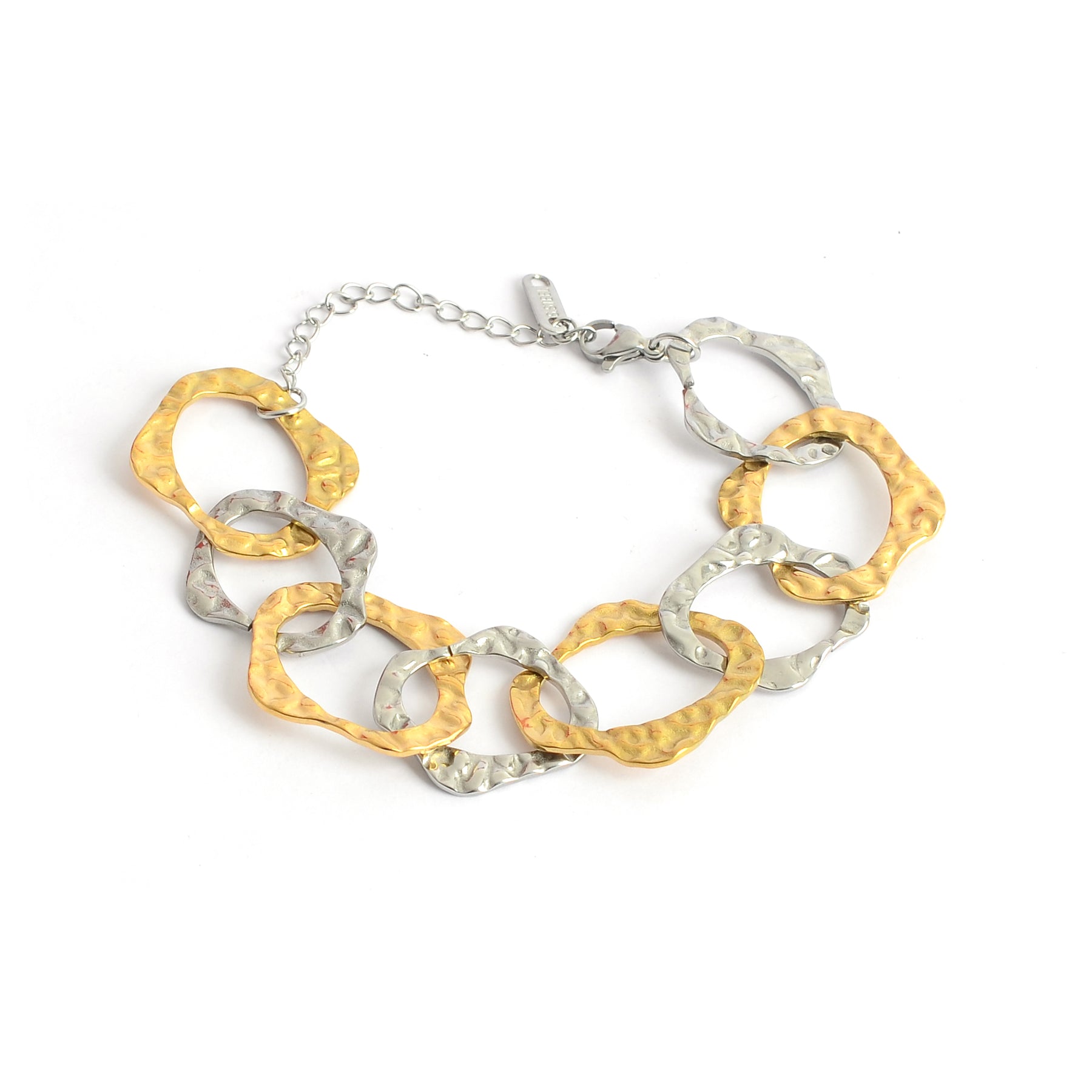 - يجمع بين اللونين الذهبي والفضي بتصميم حلقات متعرجة متداخلة كبيرة بنقشة بارزة تعطي مظهرًا فخمًا ولافتًا