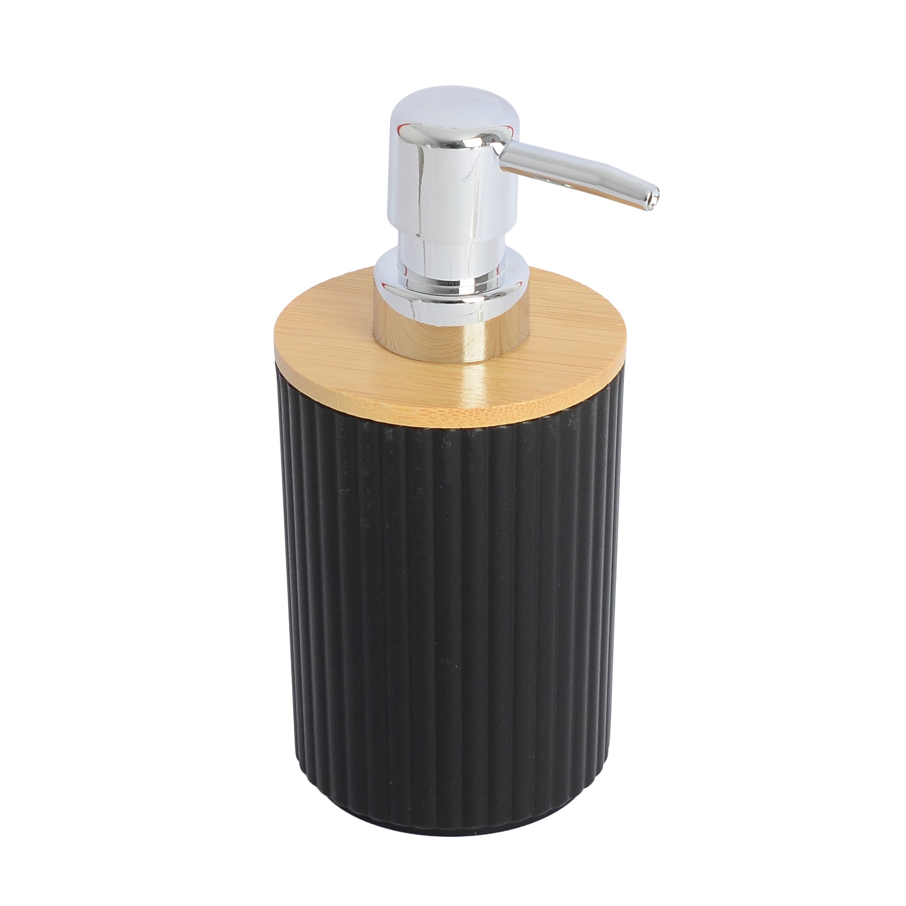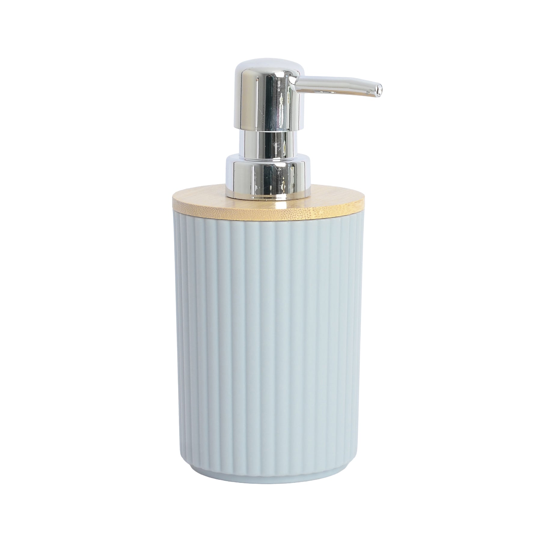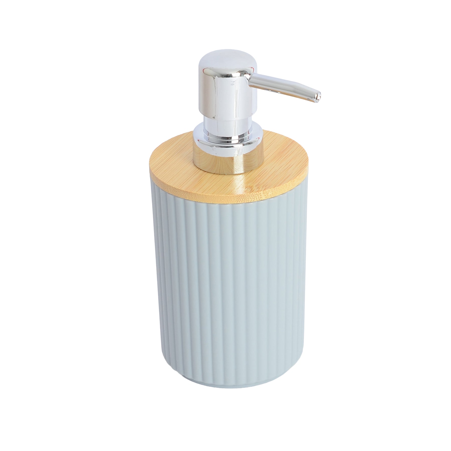 موزع صابون سائل بلاستيك بغطاء خشب 350مل ذات مضخة ، موزع صابون وشاور مصنوع من مادة ABS عالية الجودة بلمسة نهائية غير لامعة، بالإضافة إلى غطاء من الخيزران. تضفي الخطوط العمودية البارزة ولون الخيزران الطبيعي على هذا الملحق الخاص مظهرًا أصليًا وجذابًا،شكل عصرى رائع للحافظ على كمية الشاور أو الصابون السائل المستخدم ،تصميم عصري: لمسة نهائية غير لامعة مع نسيج مضلع،مضخة توزيع مطلية بالكروم: متينة وأنيقة وعملية،يتناسب مع مختلف أنماط الديكور،سهل التعبئة والتنظيف،مصنوع من مواد متينة بلمسة نهائية ممتازة،الأبعاد: الارتفاع 16 سم × القطر 7 سم