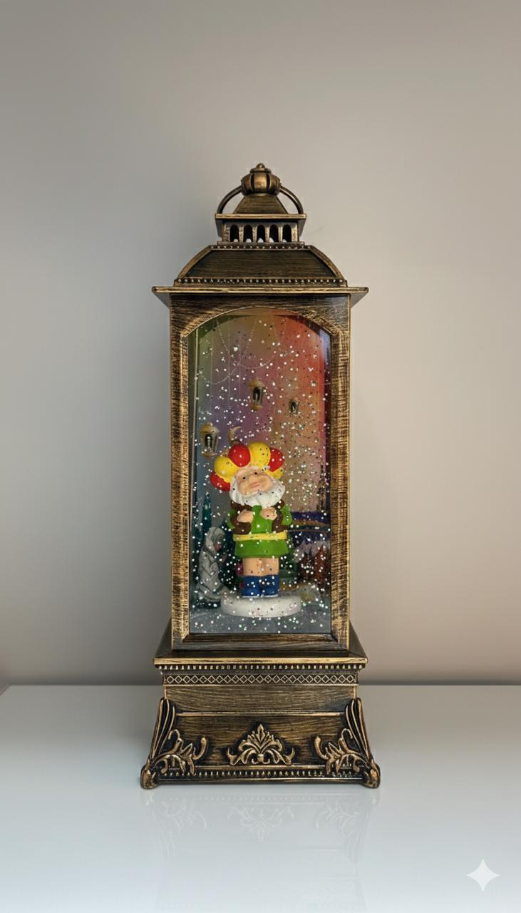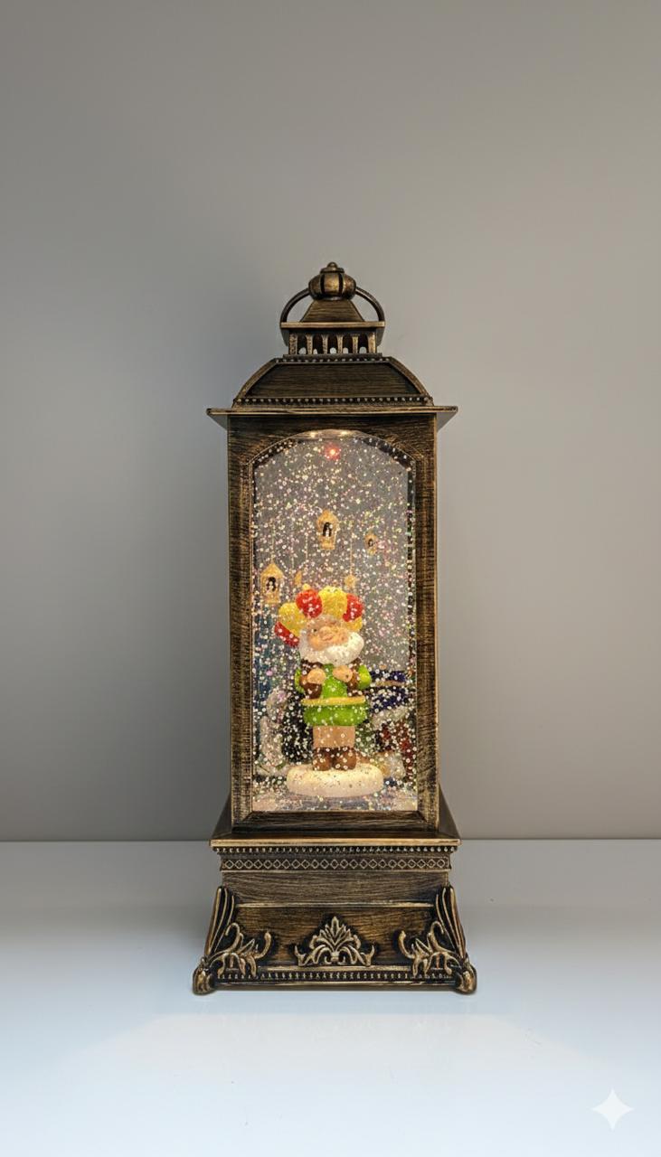 - يحتوي الفانوس علي مفتاح في الاسفل لتشغيل نغمات رمضانيه والاضاءةويتم تدوير رقائق جليتر تمثل الثلج المنثور