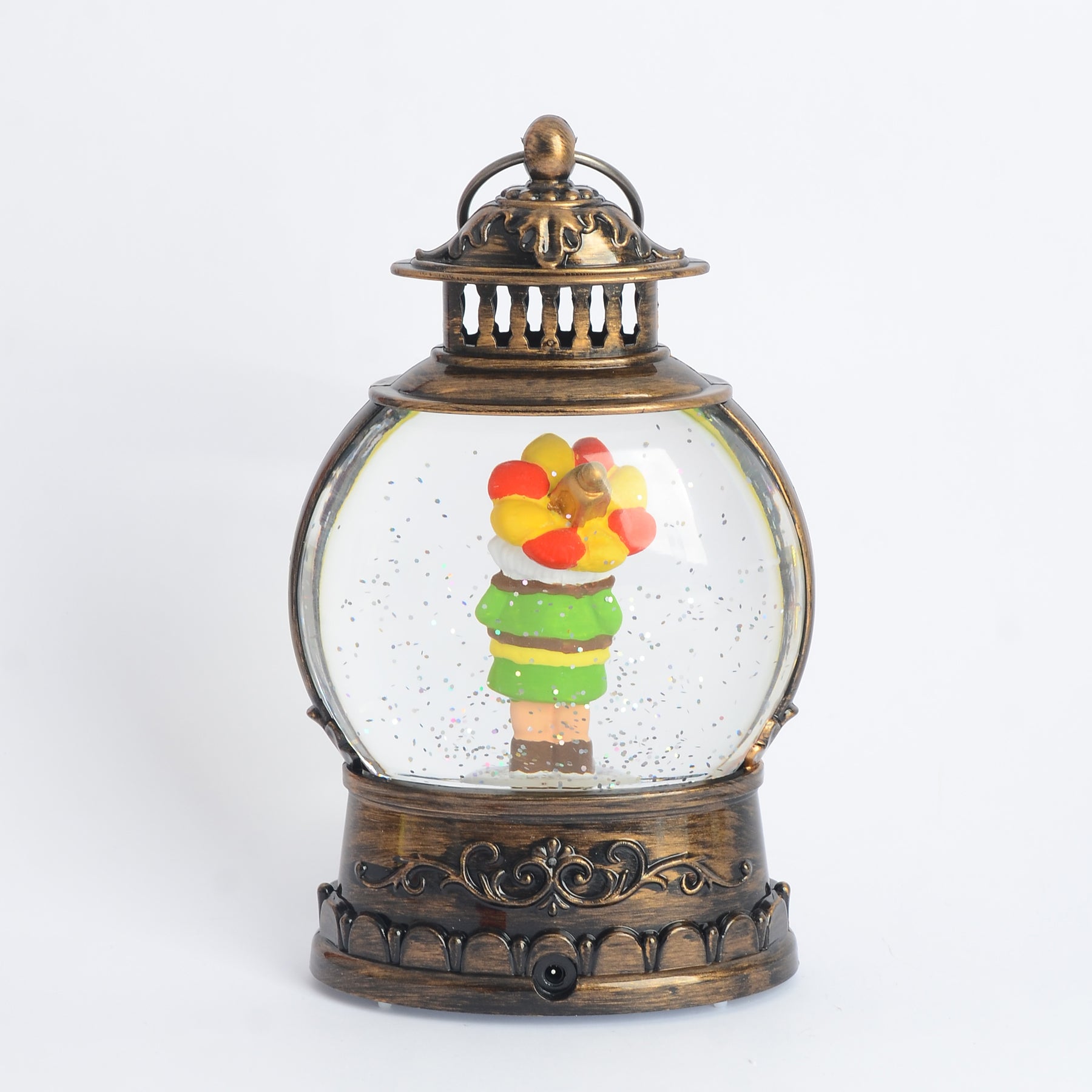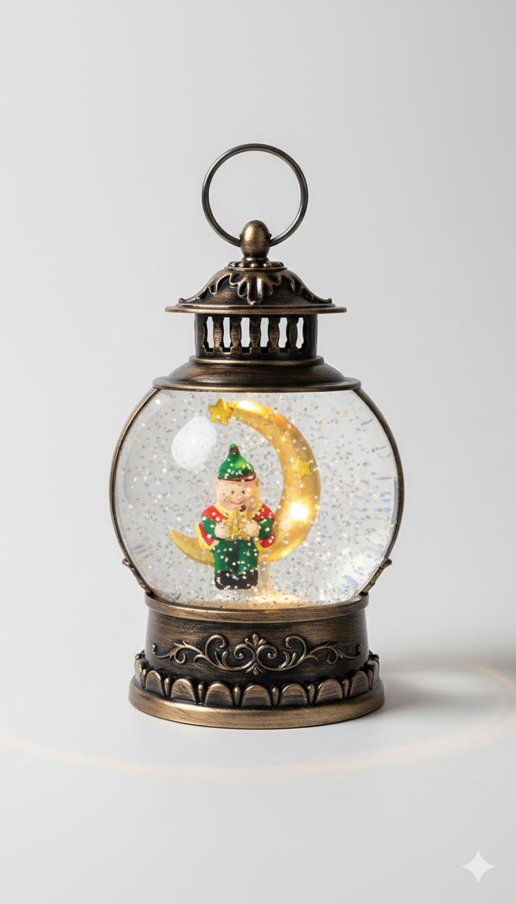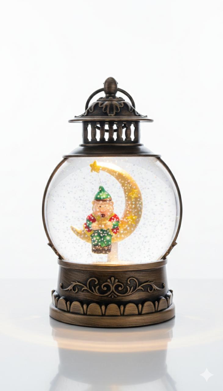 - يحتوي الفانوس علي مفتاح في الاسفل لتشغيل نغمات رمضانيه والاضاءة ويتم تدوير رقائق جليتر تمثل الثلج المنثور