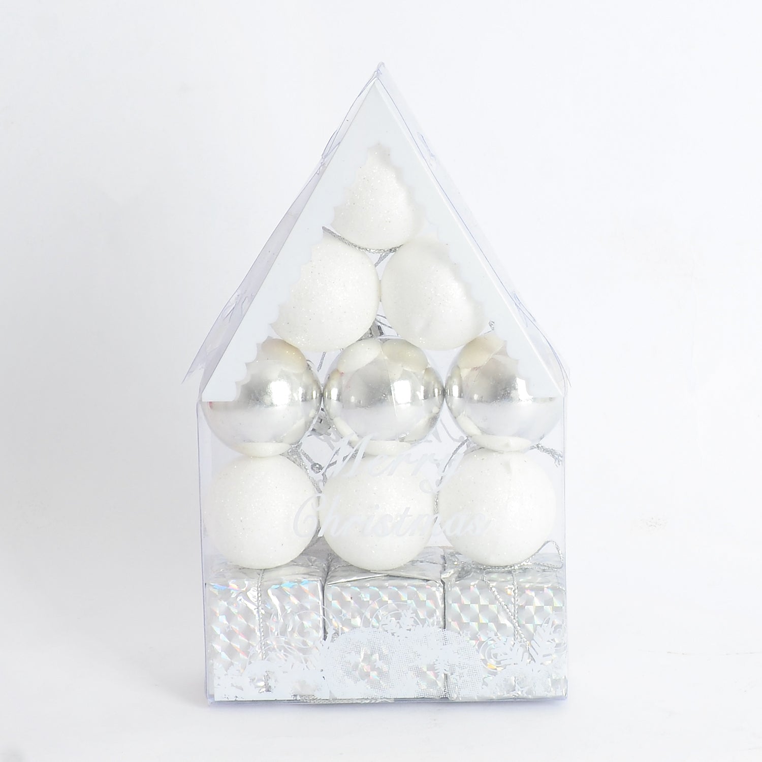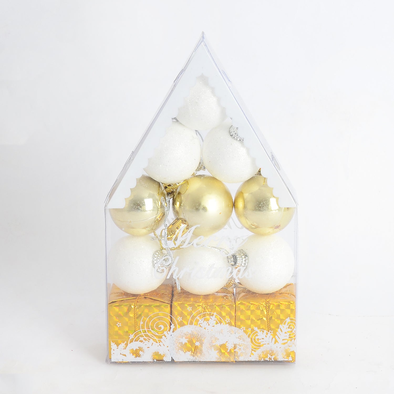• طقم كرات زينة كريسماس داخل تصميم كوخ بلاستيكي أنيق